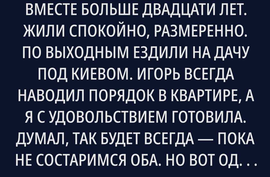 Мой муж Игорь и я прожили вместе больше двадцати лет. Жили спокойно, размеренно. По выходным ездили на дачу под Киевом. Игорь всегда наводил порядок в квартире, а я с удовольствием готовила. Думал, так будет всегда пока не состаримся оба. Но вот однажды Игорь вдруг заявил мне: