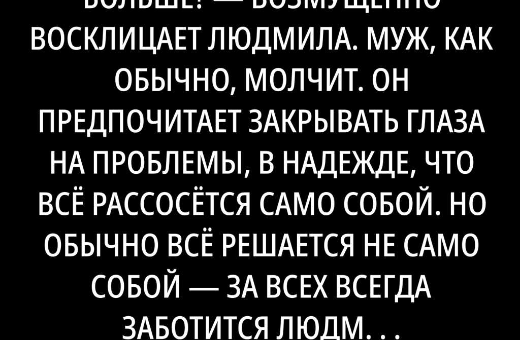 Муж, как обычно, молчит. Он предпочитает закрывать глаза на проблемы, в надежде, что всё рассосётся само собой. Но обычно всё решается не само собой за всех всегда заботится Людмила. Она работает на удалёнке из своей квартиры в Москве, дизайнерит проекты для разных компаний. График у неё гибкий, гонорары постепенно выросли: Людмила прошла пару курсов, стала зарабатывать гораздо больше супруга. Её зарплаты хватает и на оплату кредита за новую «Ладу», и на семейные поездки в Сочи, и на бытовую технику, и на одежду. Потом она ушла в декрет, но работу почти не бросила очень боялась потерять клиентов и стабильный доход.