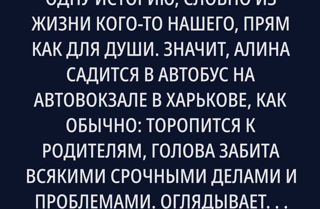 Ты знаешь, вот расскажу тебе одну историю, словно из жизни кого-то нашего, прям как для души. Значит, Алина садится в автобус на автовокзале в Харькове, как обычно: торопится к родителям, голова забита всякими срочными делами и проблемами. Оглядывается народу немного, а свободное место только одно рядом с мужчиной, чуть постарше её. Да особо она и не смотрит в его сторону: впереди семь часов дороги, а в голове сплошная каша из мыслей.