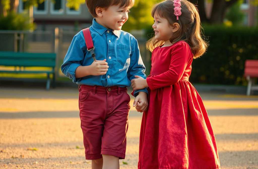 Утром Мишка твёрдым шагом подошёл к девочке в красном платьице с бантом. Взял её за руку и торжественно объявил: