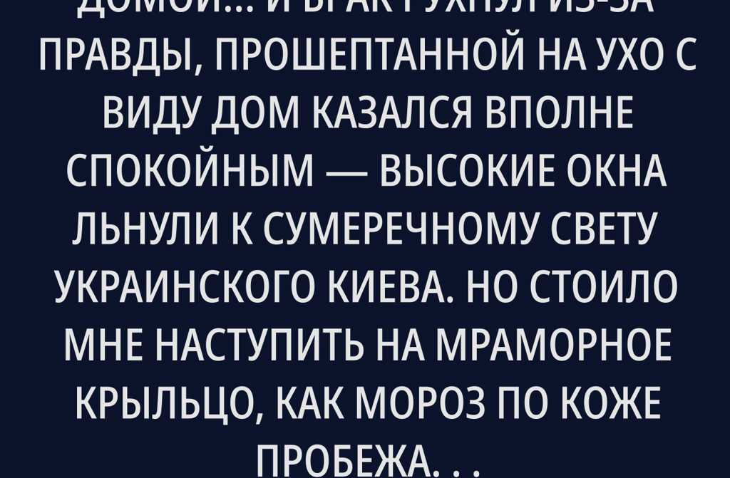 С виду дом казался вполне спокойным высокие окна льнули к сумеречному свету украинского Киева. Но стоило мне наступить на мраморное крыльцо, как мороз по коже пробежал. Воздух был настолько напряжен, что сердце стало стучать как футбольный мяч по асфальту. Интуиция подсказывала мне: я вхожу прямо в бурю.