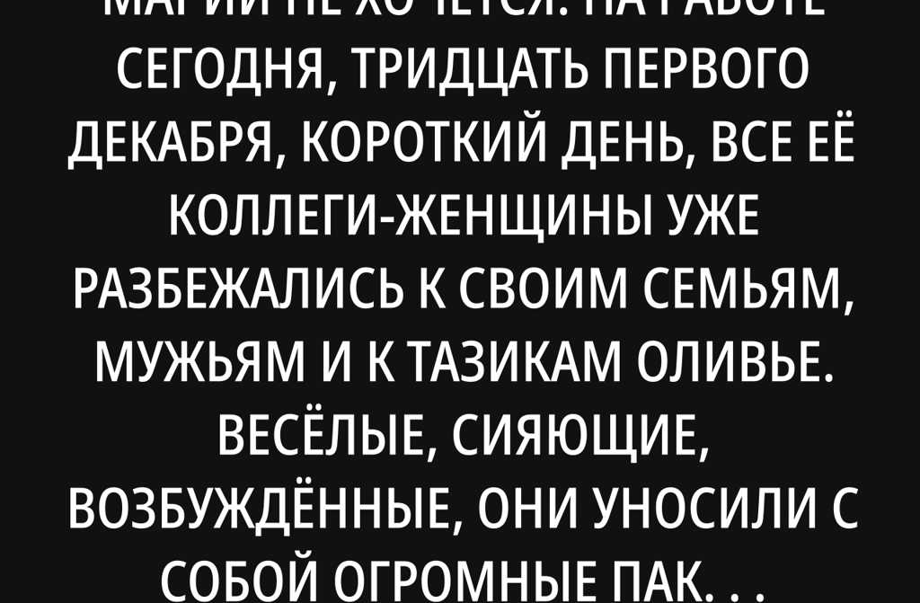 Домой Марии не хочется. На работе сегодня, тридцать первого декабря, короткий день, все её коллеги-женщины уже разбежались к своим семьям, мужьям и к тазикам оливье. Весёлые, сияющие, возбуждённые, они уносили с собой огромные пакеты с мандаринами и бутылкой игристого подарок от Павла Николаевича, их руководителя.