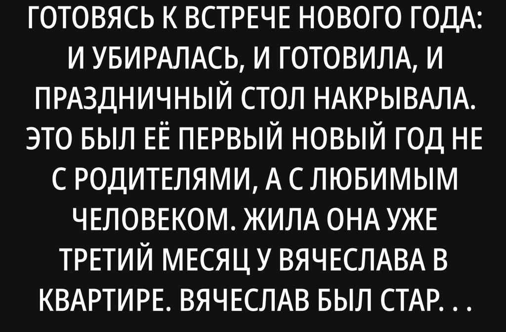 Пока Оля убиралась и варила салаты, её Вячеслав тоже «готовился» как мог: гулял с друзьями и выпивал. Явился домой довольный, навеселе, и обрадовал: «Сегодня к нам в гости мои друзья придут Новый год встречать будем компанией!» Этих его друзей Оля знать не знала. Она всё подготовила, но настроение уже было не то оставался час до боя курантов. Всё равно держалась не хотела ему перечить, ведь не зря же он всё время бывшую вспоминал