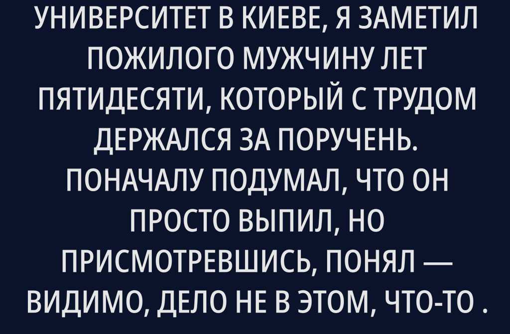 Сегодня утром, когда ехал на автобусе по дороге в университет в Киеве, я заметил пожилого мужчину лет пятидесяти, который с трудом держался за поручень. Поначалу подумал, что он просто выпил, но присмотревшись, понял видимо, дело не в этом, что-то явно не так. Как оказалось, мы оба вышли на одной остановке, что вызвало у меня интерес, и я решил следить за ним. Его ход был неуверенным, и тревога заставила меня подойти поближе.