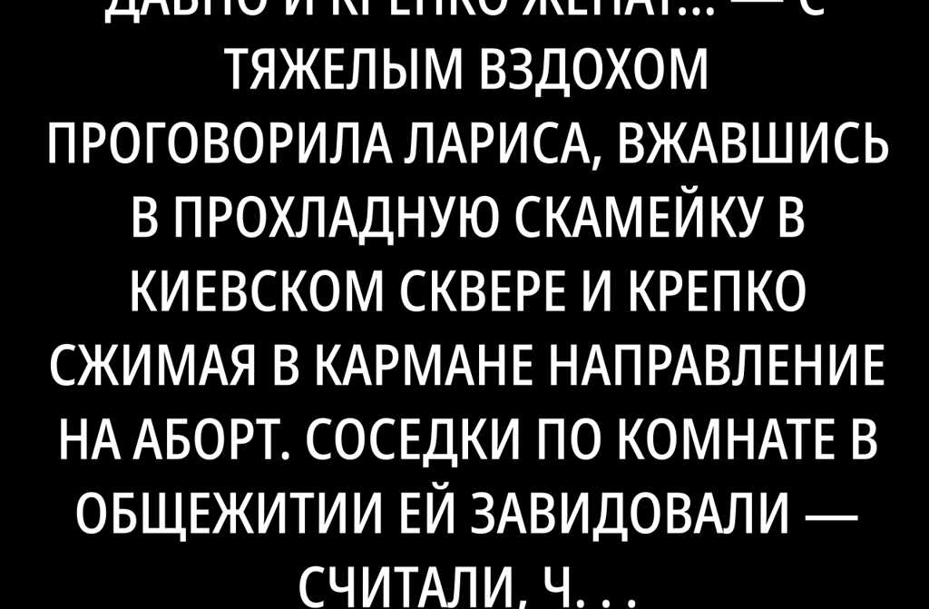 А Костя, оказывается, давно и крепко женат… с тяжелым вздохом проговорила Лариса, вжавшись в прохладную скамейку в киевском сквере и крепко сжимая в кармане направление на аборт.