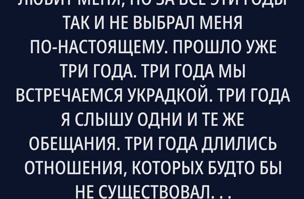 Прошло уже три года. Три года мы встречаемся украдкой. Три года я слышу одни и те же обещания. Три года длились отношения, которых будто бы не существовало только тогда, когда его жена где-то далеко.