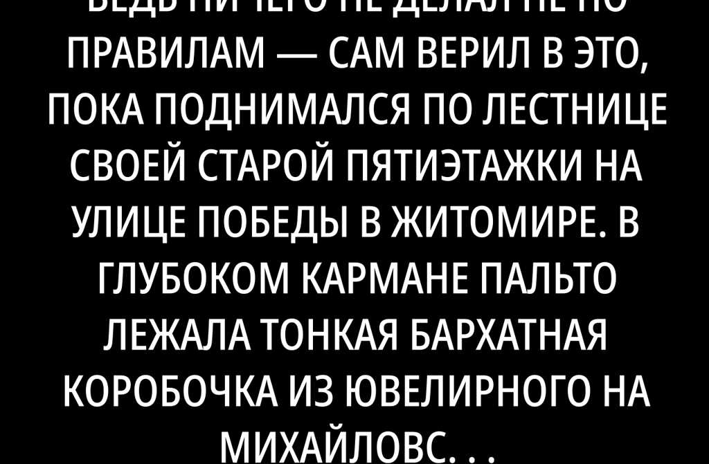 Он ведь ничего не делал не по правилам сам верил в это, пока поднимался по лестнице своей старой пятиэтажки на улице Победы в Житомире. В глубоком кармане пальто лежала тонкая бархатная коробочка из ювелирного на Михайловской «Сапфир», выбор серьёзный, не с ярмарки. Пальцы Виктора то и дело щупали коробочку, будто её можно было умыкнуть с поправкой на квантовую физику. Кольцо дорогое, выбирал час продавщица на четвёртой уже устало одобряла всё подряд. Он представлял, как Олеся (а кому тут Светланы, если в каждом подъезде по две!) обрадуется. Ну ещё бы десять лет вместе, не шутки.