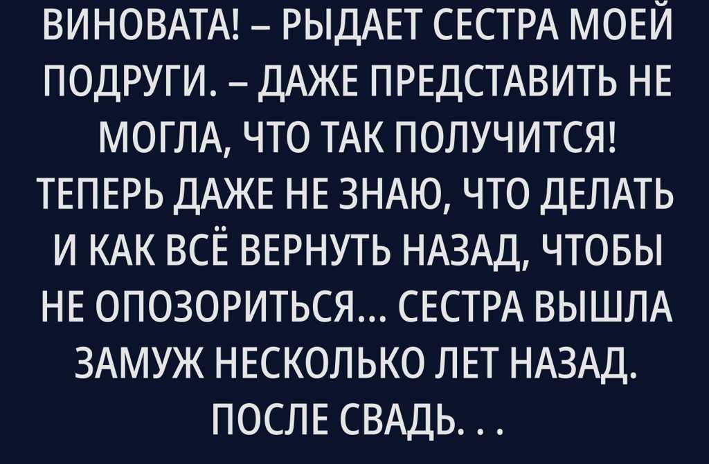 Ну, конечно, во всём я сама виновата! рыдает сестра моей подруги. Даже представить не могла, что так получится! Теперь даже не знаю, что делать и как всё вернуть назад, чтобы не опозориться