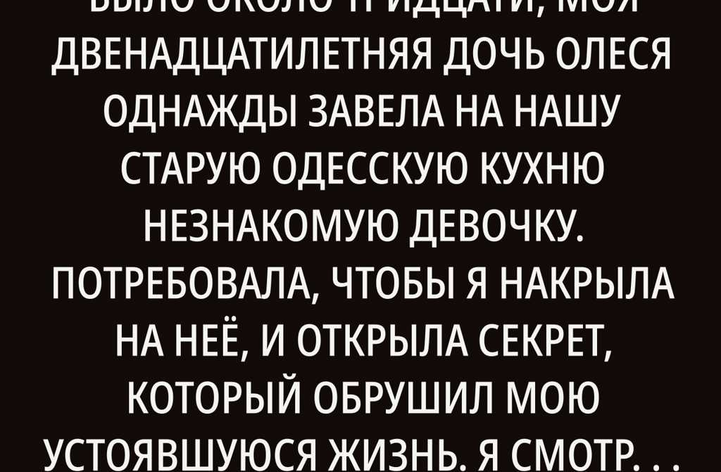 Когда мне было около тридцати, моя двенадцатилетняя дочь Олеся однажды завела на нашу старую одесскую кухню незнакомую девочку. Потребовала, чтобы я накрыла на неё, и открыла секрет, который обрушил мою устоявшуюся жизнь.