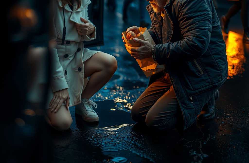 Женщина подошла к нищему и к ужасу прохожих опустилась прямо в промозглую лужу рядом с ним, не думая о том, как это отражается на её дорогой одежде. В обеих руках она держала пакет с ещё горячими, ароматными пирожками из ближайшей пекарни.