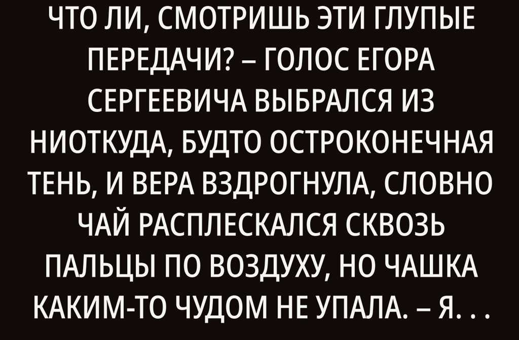 Опять, что ли, смотришь эти глупые передачи? голос Егора Сергеевича выбрался из ниоткуда, будто остроконечная тень, и Вера вздрогнула, словно чай расплескался сквозь пальцы по воздуху, но чашка каким-то чудом не упала. Я же сказал, эти шоу только мысли загрязняют. Лучше бы брызги на плите вытерла, или о семье подумала. Без дела в тоску и впадаешь.