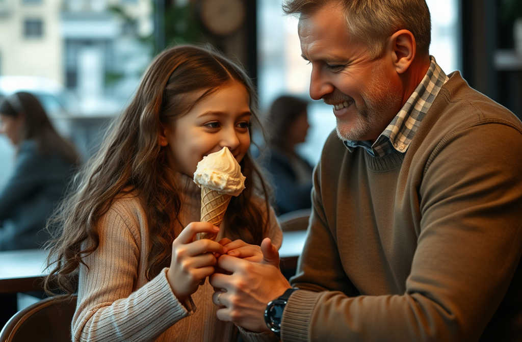 Поняла то, что задумал папа, важнее самого вкусного мороженого, поэтому решительно бросила ложку на стол, сползла со стула, вытерла губы тыльной стороной ладони, носом шмыгнула и, смотря прямо на папу, сказала: