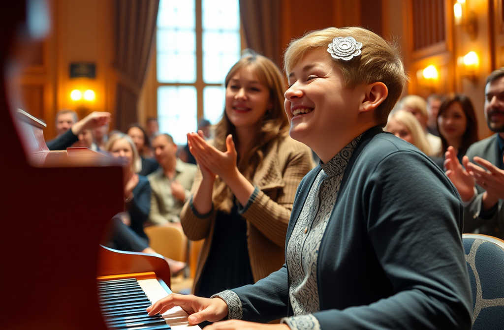 Костя вышел на сцену серьёзный, собранный, в белой рубашке и чёрных брюках. Сел за рояль, положил руки на клавиши.