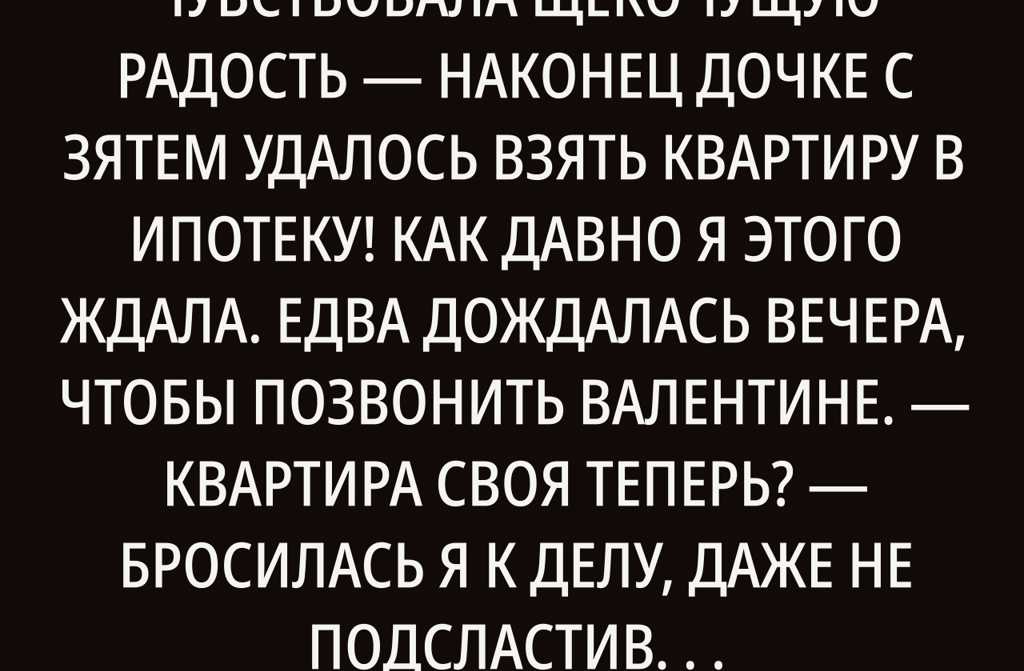 Целый день чувствовала щекочущую радость наконец дочке с зятем удалось взять квартиру в ипотеку! Как давно я этого ждала. Едва дождалась вечера, чтобы позвонить Валентине.