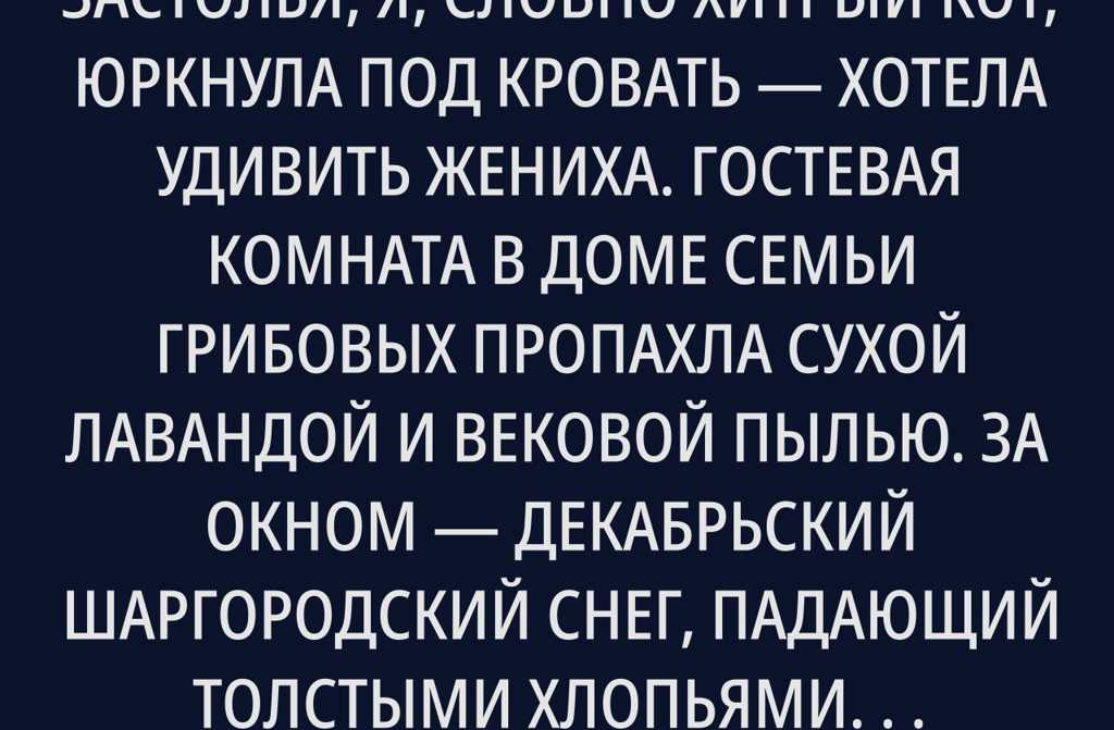 После нашего новогоднего застолья, я, словно хитрый кот, юркнула под кровать хотела удивить жениха. Гостевая комната в доме семьи Грибовых пропахла сухой лавандой и вековой пылью. За окном декабрьский шаргородский снег, падающий толстыми хлопьями, будто большими белыми пельменями. Внутри тепло, пахнет жареной бужениной и разносится приглушённый смех.