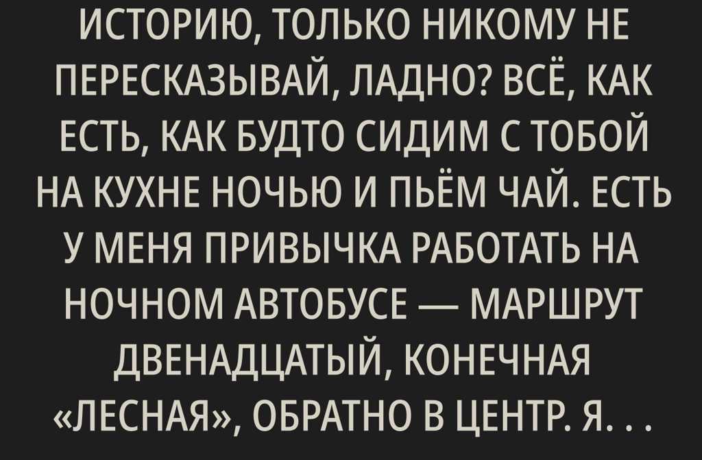 Есть у меня привычка работать на ночном автобусе маршрут двенадцатый, Конечная «Лесная», обратно в центр. Я на нём уже четвёртый год, и знаешь, полюбила я эти ночные смены. Как будто город становится моим, тише, чище, спешки никакой, свет фонарей да шуршание шин. И никто не пристаёт: ни бабки с авоськами, ни школьники шумные, ни эти, которые после клуба до дому не дойдут.