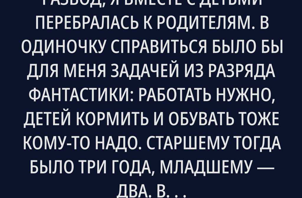 Когда мой муж подал на развод, я вместе с детьми перебралась к родителям. В одиночку справиться было бы для меня задачей из разряда фантастики: работать нужно, детей кормить и обувать тоже кому-то надо. Старшему тогда было три года, младшему два. Весёлое было времечко, не поспоришь.