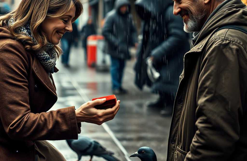 Небо моросит мелким дождём, словно серый шёлковый занавес, а люди спешат мимо, пряча лица под зонтами. Никто не замечает женщину в бежевом пальто, стоящую на коленях посреди перекрёстка. Её голос дрожит. «Пожалуйста выйди за меня замуж», шепчет она, сжимая в руках бархатную коробочку. Мужчина, которому она делает предложение? Неделями он не брился, носит потрёпанное пальто, заклеенное скотчем, и спит в подворотне в двух шагах от Тверской улицы.