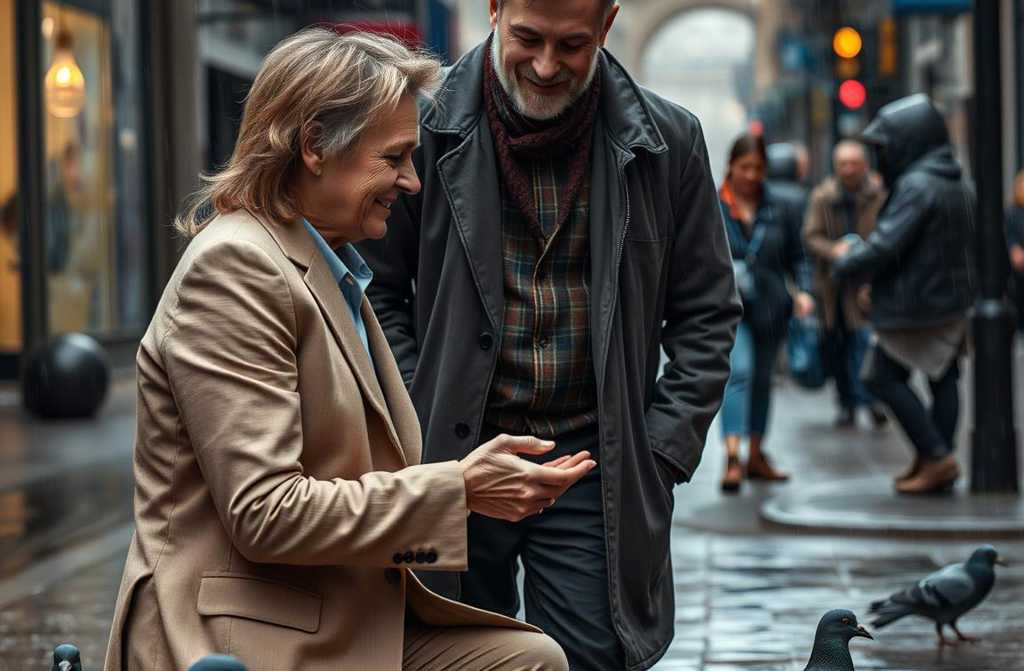 Анна не придала этому значения пока сама не увидела. Бездомный, лет сорока, с тёплыми глазами под слоями грязи и бороды, аккуратно раскладывал крошки на парапете, ласково беседуя с каждым голубем, будто со старым другом. Артём стоял рядом, глядя на него с таким спокойствием, какого мать не видела у него месяцами.