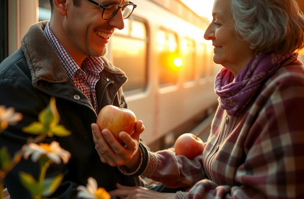 На обратном пути он встречает ту же женщину, что и утром. Они делят яблоки, смеются, обсуждая свои огородные дела. Пожилая женщина уверяет Андрея, что впереди много лет жизни, подбадривает его находить радость и цель в этой работе. Когда он выходит на своей станции, Андрей улыбается закату, ощущая спокойствие и больше не чувствуя былой грусти.