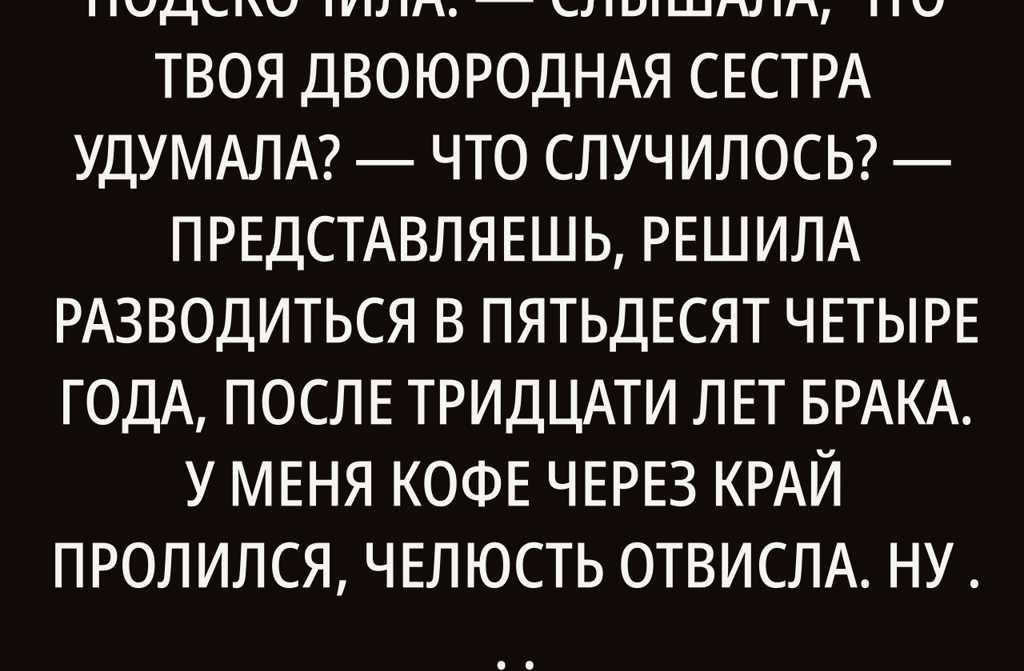 У меня кофе через край пролился, челюсть отвисла. Ну как так? Всегда казалось обычная семья: муж не пьёт, сейчас уже на пенсии, старше её на девять лет. Трое взрослых детей, все разъехались, пять внуков. И вдруг она взяла, да и решила: развод!