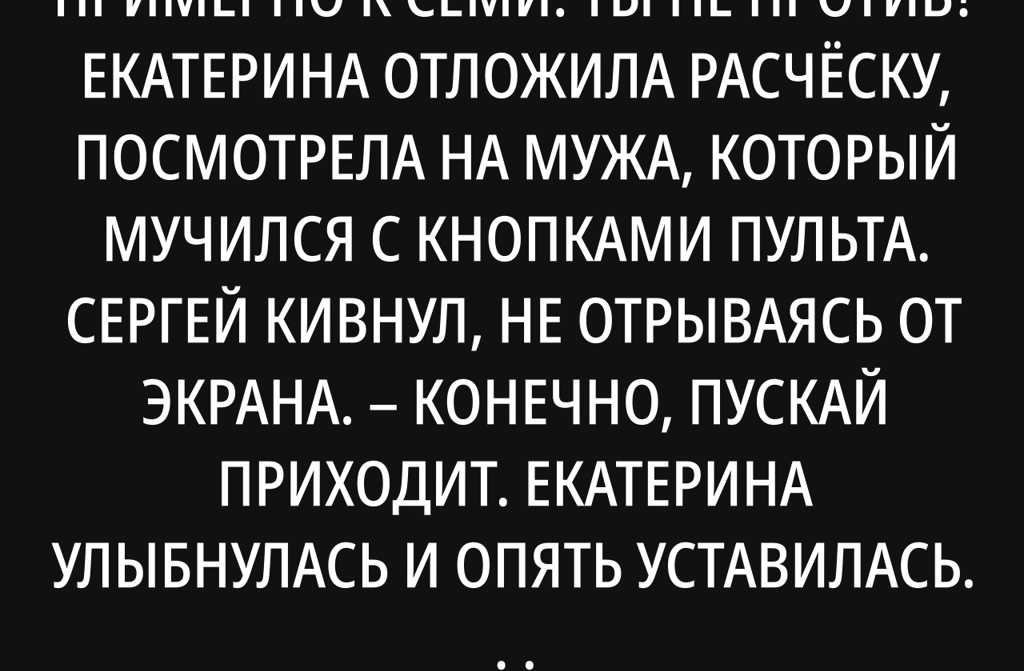 Екатерина отложила расчёску, посмотрела на мужа, который мучился с кнопками пульта. Сергей кивнул, не отрываясь от экрана.