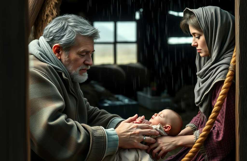 Дверь скрипнула, открываясь в мрак. Запах сырой соломы и чего-то ещё — человеческого, тёплого. Свет лампы дрожал, выхватывая из тьмы невозможное: на груде старых одеял лежала молодая женщина, вся промокшая, с двумя младенцами на руках. Губы её посинели от холода, но руки держали детей крепко, будто они были последним, что у неё осталось.
