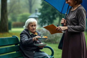 Она достаёт свежий укроп, мелко нарезает, посыпает яичницу, внимательно смотрит на стаканы, тщательно моет их, готовит кофе.