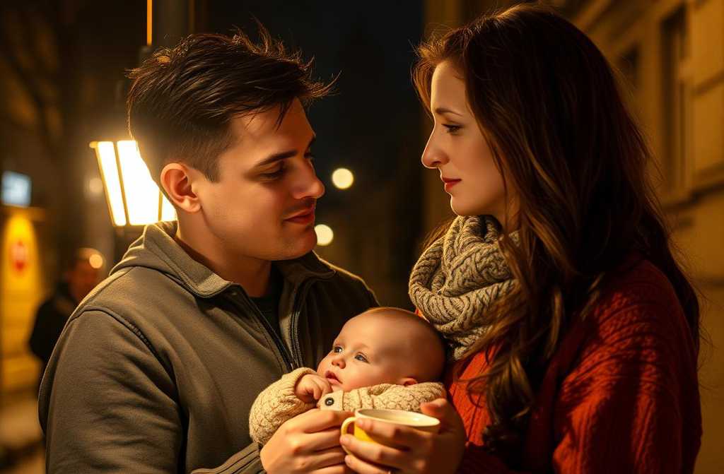 Они идут по ночному городу, ребёнок плачет. Наконец Никита не выдерживает:
