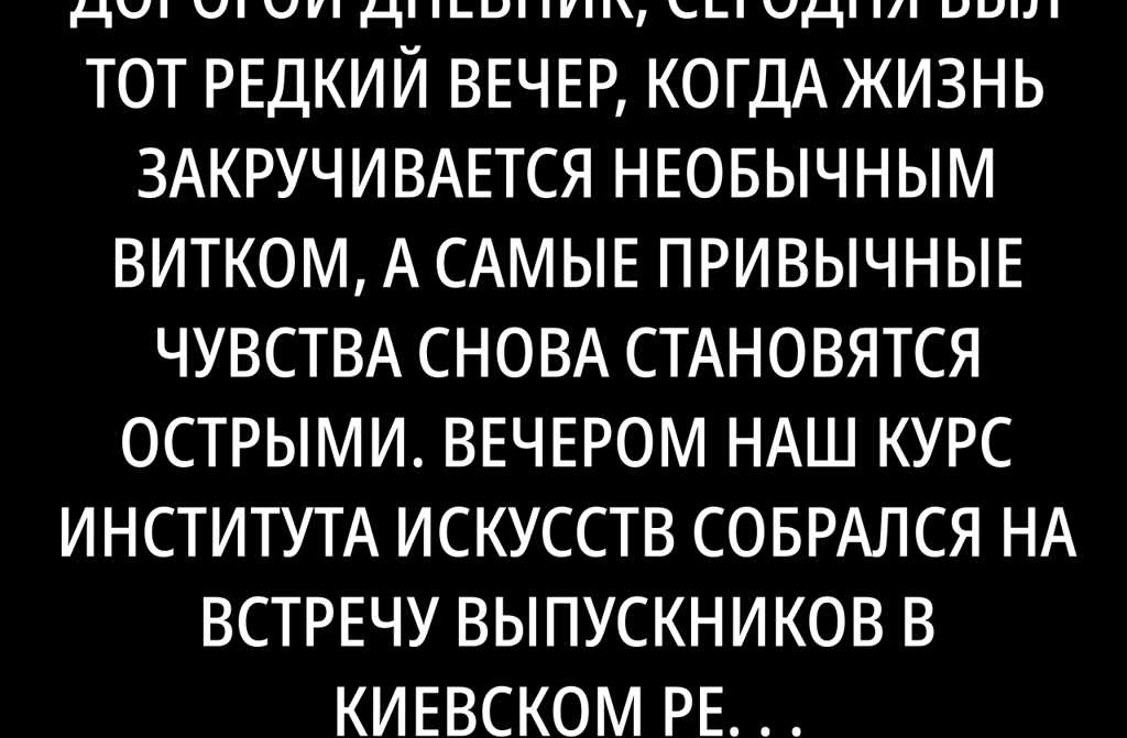 Сегодня был тот редкий вечер, когда жизнь закручивается необычным витком, а самые привычные чувства снова становятся острыми. Вечером наш курс Института искусств собрался на встречу выпускников в киевском ресторане «Вернигора». Десять лет назад, кажется, совсем недавно, в этом же городе мы с волнением получали дипломы, нервно строили планы, гадали о будущем а теперь волновались подругому: хотелось посмотреть на себя и друг на друга, узнать, кто кем стал, как сложилась жизнь. Один коллега приехал из Львова, ктото пришёл со спутниками, а ктото, как и я, появился один, но в предвкушении светлых воспоминаний.