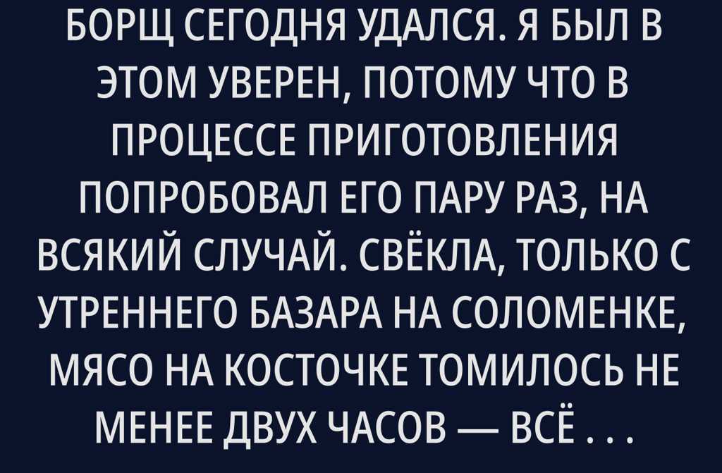 Борщ сегодня удался. Я был в этом уверен, потому что в процессе приготовления попробовал его пару раз, на всякий случай. Свёкла, только с утреннего базара на Соломенке, мясо на косточке томилось не менее двух часов всё как положено. Чеснок добавил в самом конце, иначе какой смысл. На столе свечи, белоснежная льняная скатерть, бережно хранимая для настоящих событий. Пятнадцать лет вместе неужели не повод?