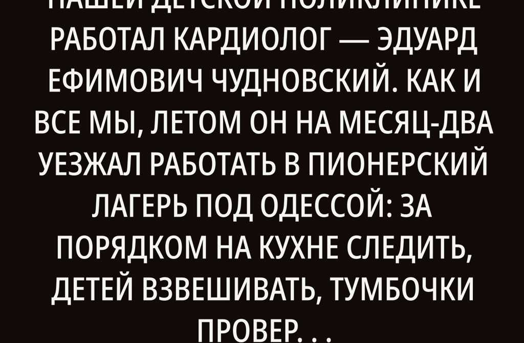 В нашей детской поликлинике работал кардиолог Эдуард Ефимович Чудновский. Как и все мы, летом он на месяц-два уезжал работать в пионерский лагерь под Одессой: за порядком на кухне следить, детей взвешивать, тумбочки проверять, зелёнкой порезы мазать если что серьезнее не случится, не дай Бог.