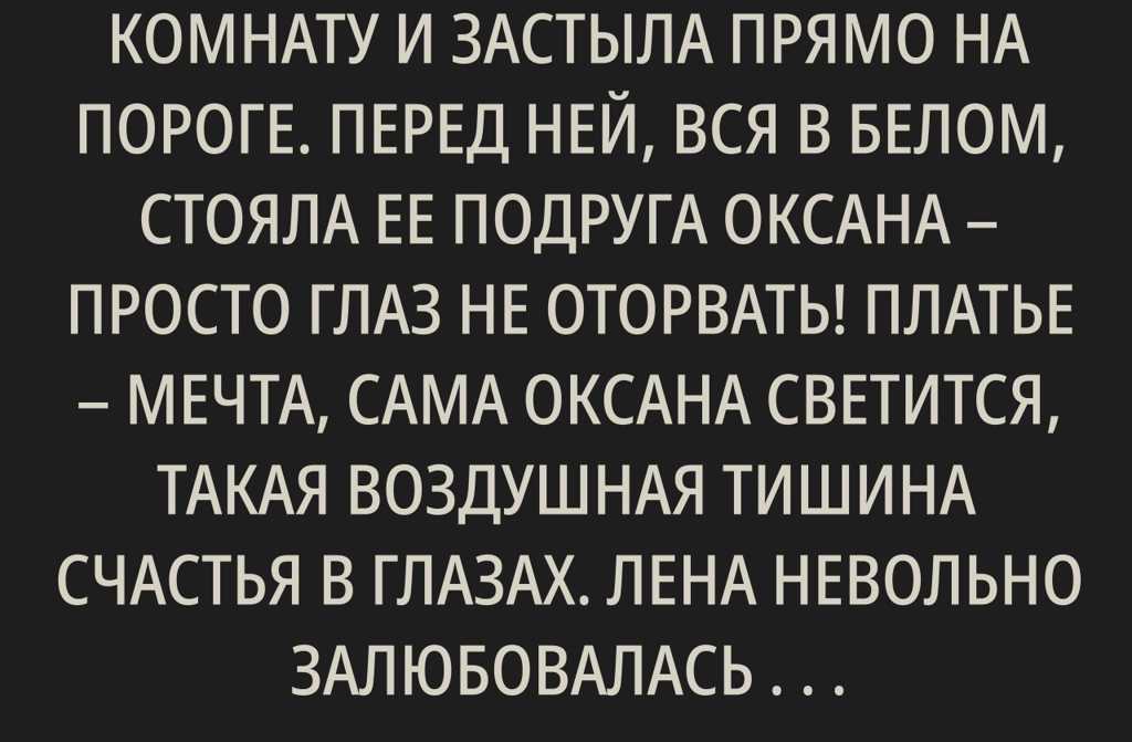 Лена влетела в комнату и застыла прямо на пороге. Перед ней, вся в белом, стояла ее подруга Оксана просто глаз не оторвать! Платье мечта, сама Оксана светится, такая воздушная тишина счастья в глазах. Лена невольно залюбовалась и выдала с места в карьер: