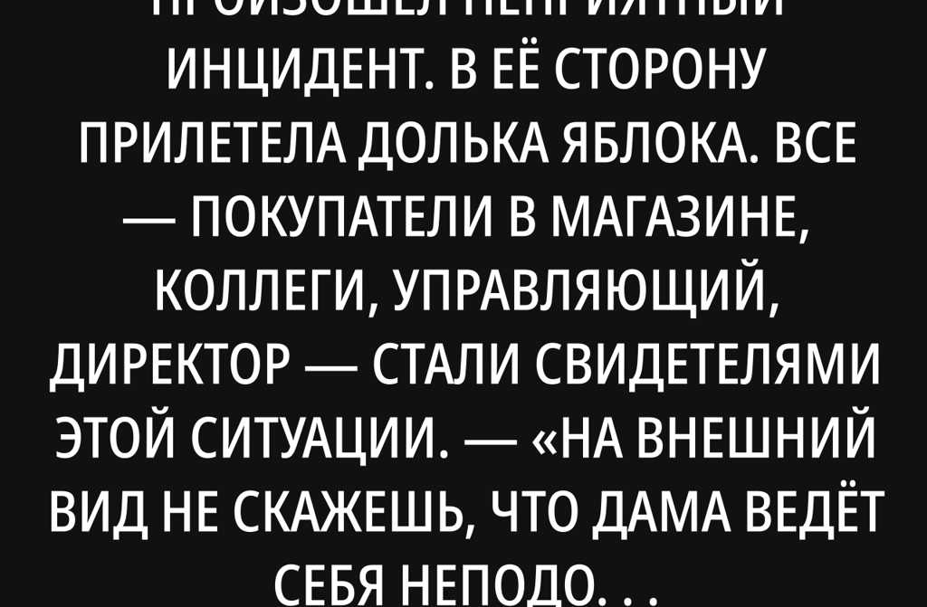 Сегодня у Светланы на работе произошёл неприятный инцидент. В её сторону прилетела долька яблока. Все покупатели в магазине, коллеги, управляющий, директор стали свидетелями этой ситуации.