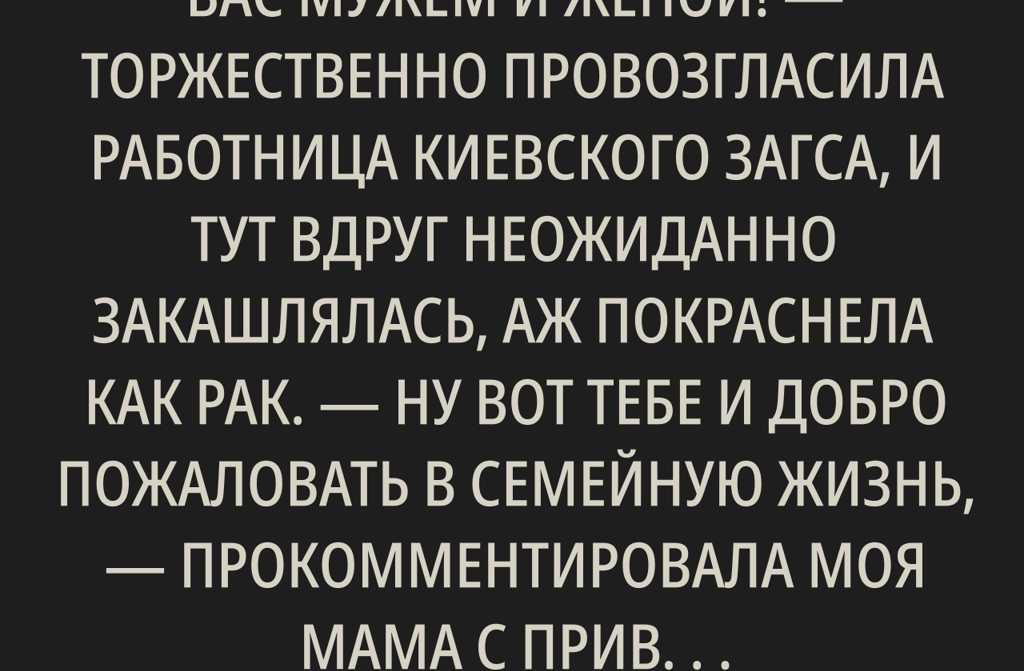 Объявляю вас мужем и женой! торжественно провозгласила работница киевского ЗАГСа, и тут вдруг неожиданно закашлялась, аж покраснела как рак.