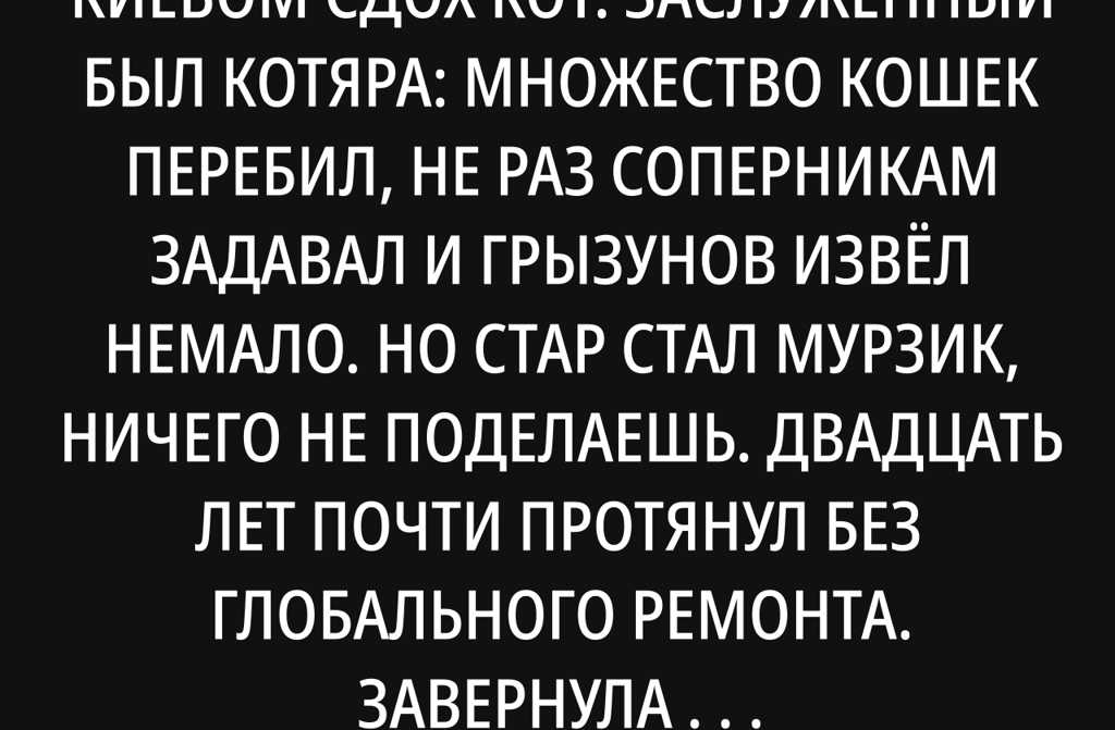 У тётки Дуси в посёлке под Киевом сдох кот. Заслуженный был котяра: множество кошек перебил, не раз соперникам задавал и грызунов извёл немало. Но стар стал мурзик, ничего не поделаешь. Двадцать лет почти протянул без глобального ремонта.