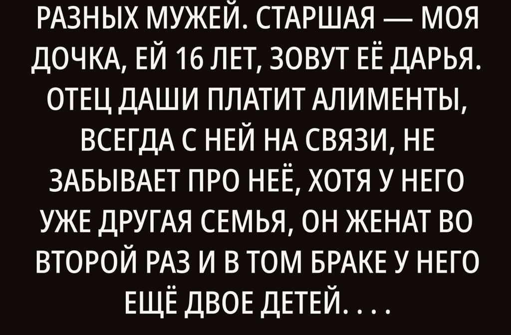 У меня двое детей. Они от разных мужей. Старшая моя дочка, ей 16 лет, зовут её Дарья. Отец Даши платит алименты, всегда с ней на связи, не забывает про неё, хотя у него уже другая семья, он женат во второй раз и в том браке у него ещё двое детей.