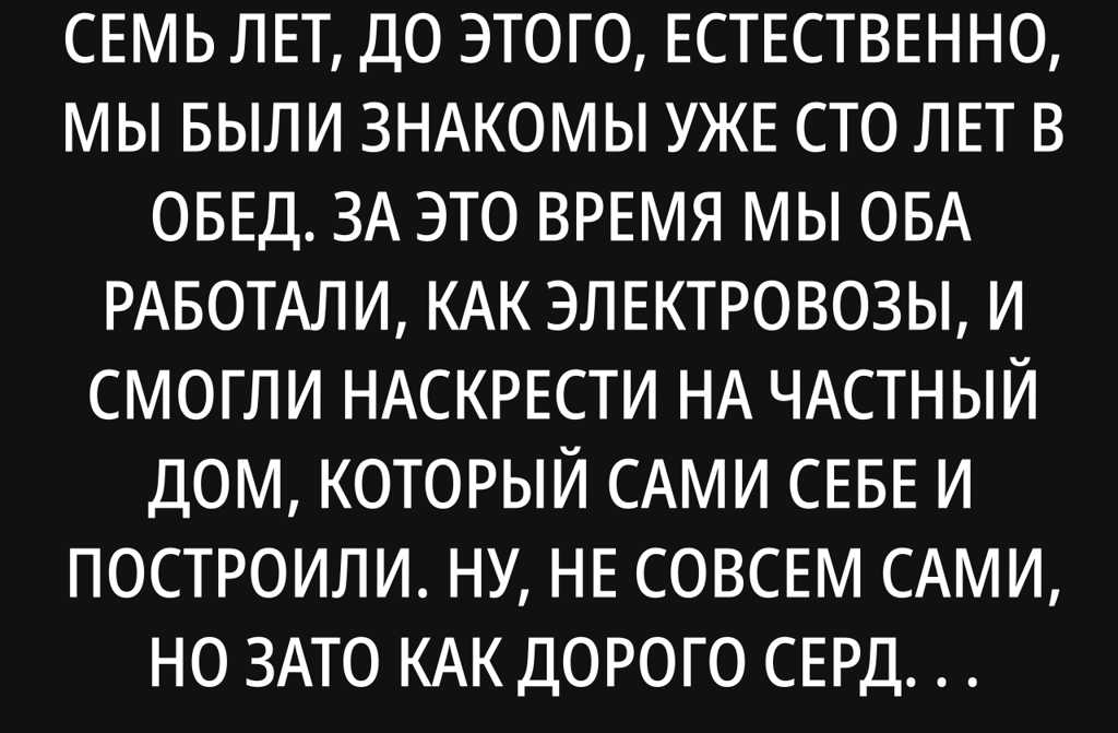 Мой муж и я женаты почти семь лет, до этого, естественно, мы были знакомы уже сто лет в обед. За это время мы оба работали, как электровозы, и смогли наскрести на частный дом, который сами себе и построили. Ну, не совсем сами, но зато как дорого сердцу!