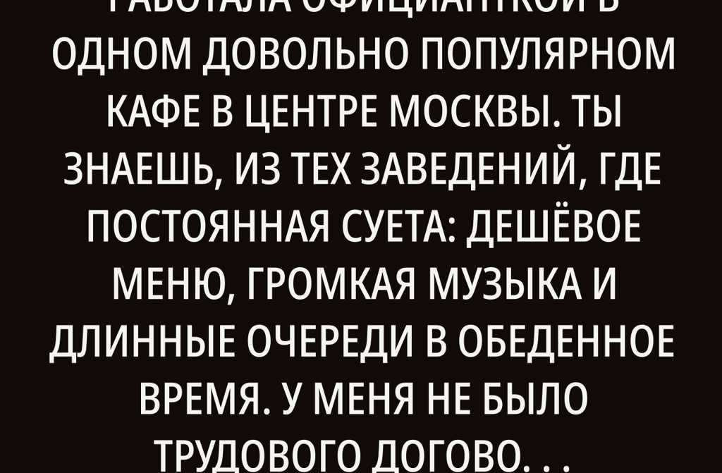 Когда мне было двадцать три, я работала официанткой в одном довольно популярном кафе в центре Москвы. Ты знаешь, из тех заведений, где постоянная суета: дешёвое меню, громкая музыка и длинные очереди в обеденное время. У меня не было трудового договора, никаких соцгарантий вообще ничего. Зарплату выдавали по итогам дня: не вышла не заплатят, заболела никого не волнует. Но всё равно я приходила раньше всех и уходила последней. Заказы помнила наизусть, терпела хамство клиентов, убирала столы, голодная и уставшая, но мне нужны были эти рубли.