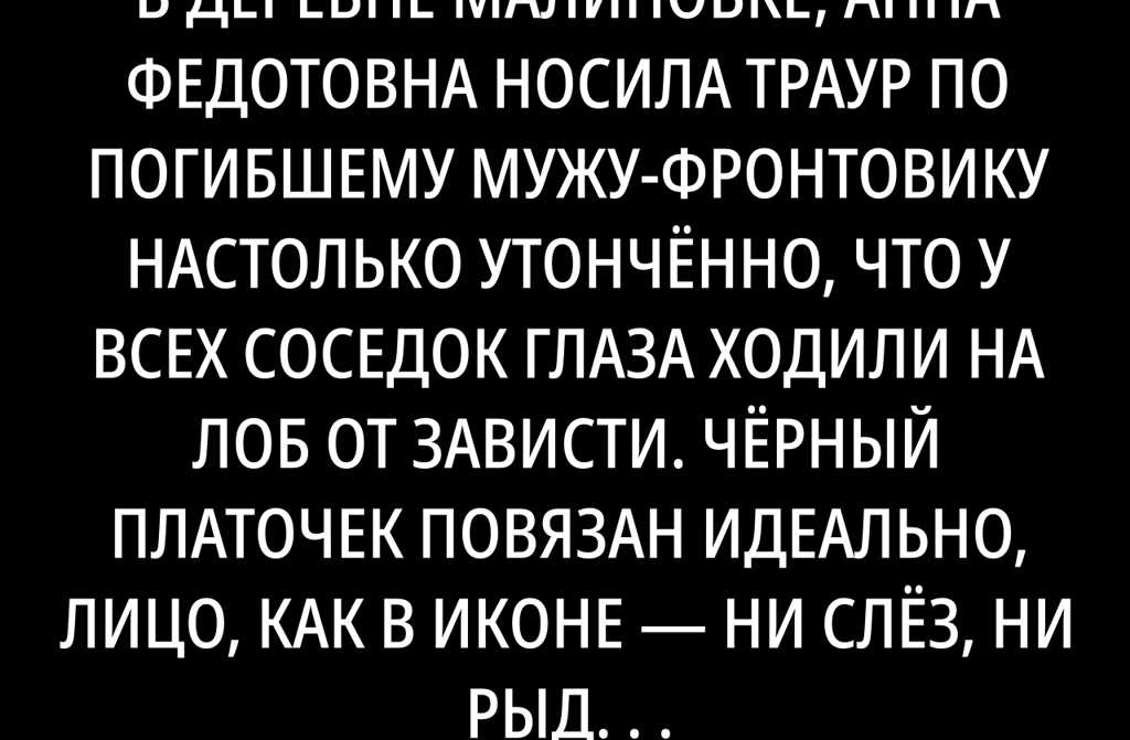 Тихой поступью, в 1943-м году, в деревне Малиновке, Анна Федотовна носила траур по погибшему мужу-фронтовику настолько утончённо, что у всех соседок глаза ходили на лоб от зависти. Чёрный платочек повязан идеально, лицо, как в иконе ни слёз, ни рыданий, только гордая осанка. А уж как у Анны шли вдовьи платья! Остальные вдовы даже сапоги начищали с удвоенным усердием вдруг поможет.