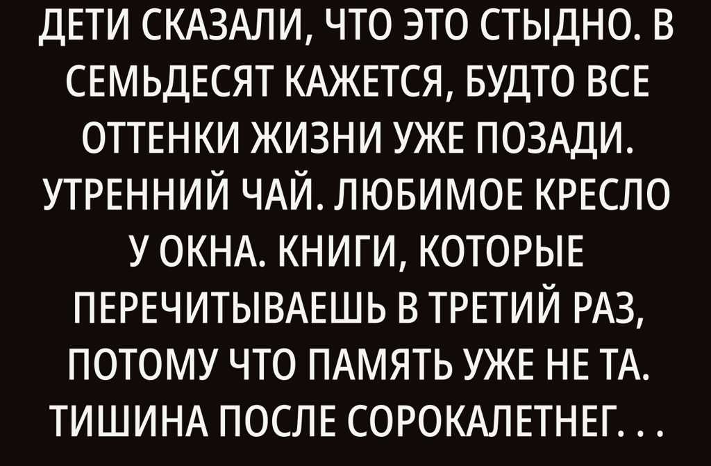 В семьдесят кажется, будто все оттенки жизни уже позади. Утренний чай. Любимое кресло у окна. Книги, которые перечитываешь в третий раз, потому что память уже не та. Тишина после сорокалетнего брака, когда остаешься один.