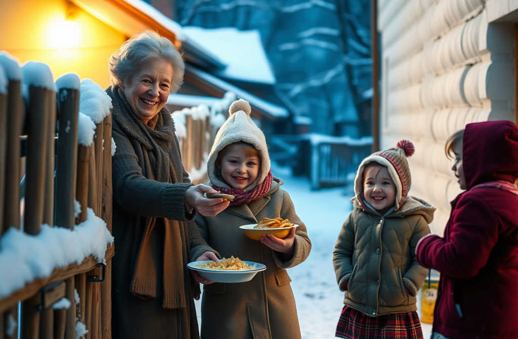 — Вот тебе от мамы, для тебя и твоих братишек. Кушайте, детки. Не грех делиться — грех закрывать глаза. Алинке было всего шесть, но на её плечах уже лежала ноша, которую не каждый взрослый вынесет. Она жила в крохотной деревне, где время будто забыло дорогу. Их старенький дом держался не на стенах, а на маминых молитвах. Когда задувал ветер, доски скрипели, словно плакал кто-то, а ночами холод пробирался сквозь щели без разрешения. Родители работали по случаю: сегодня нанялись, а завтра — нет. Иногда возвращались усталые, с потрескавшимися руками и усталыми глазами, а порой с пустыми карманами, такими же пустыми, как и надежда. Алинка оставалась дома с двумя младшими братишками и прижимала их к себе всякий раз, когда голод был сильнее холода. В тот день был декабрь. Самый настоящий, с серым небом и воздухом, пахнущим снегом. Рождество стучалось в окна, но явно не в их дом. В чугунке на плите булькала простая картофельная похлёбка — без мяса, без специй, но с маминым теплом. Алина мешала её, будто хотела, чтобы хватило на всех. Вдруг из соседнего двора донёсся аромат — тёплый, зовущий, проникающий прямо в душу. Соседи резали на Рождество свинью. Звучали весёлые голоса, смех, звон тарелок и шкворчание мяса в большом казане. Для Алины эти звуки были как сказка, рассказанная чужими. Она подошла к забору, за ней прижались братишки, вцепившись в её пальто. Глотнула слюну. Она ничего не просила, просто смотрела — и в огромных карих глазах жила тихая мечта. Мама учила не завидовать чужому, но маленькое сердце не умело не мечтать. — Господи, хоть бы чуточку… — прошептала она. Как будто само небо услышало её, сквозь холод прорвалась добрая бабушкина речь: — Алиночка! Иди-ка сюда, родная! Бабушка Вера стояла у казана, румяная от огня, с глазами тёплыми, как печка. Мешала кукурузную кашу и смотрела на Алину с нежностью, которую та почти забыла. — Вот, возьми, для тебя и братишек. Кушайте, детки, — сказала она просто и по-доброму. Алина замерла от стеснения, не зная, можно ли радоваться. Но бабушка снова позвала, наполнила судочек горячим мясом с праздничным ароматом. — Кушайте, детки. Не грех делиться — грех закрывать глаза. Алиныны слёзы лились сами собой. Это были не слёзы голода. Вот впервые кто-то видел в ней просто ребёнка, а не «бедную девочку». Она побежала домой, прижимая тёплый судочек к груди, точно святыню. Братишки бросились к ней, а в маленьком доме вдруг поселился смех, тепло и такой аромат, которого тут никогда не бывало. Когда вечером родители вернулись усталые и замёрзшие, нашли детей смеющимися с полными животами. Мама в тишине заплакала, а отец снял шапку и перекрестился. В ту ночь не было ёлки и подарков. Но в доме была доброта. А иногда — этого достаточно, чтобы не чувствовать себя одиноким на целом свете. И сейчас есть такие дети, как Алиночка, которые не просят… просто смотрят. Смотрят на светлые дворы, на богатые столы, на чужое Рождество. Иногда тарелка еды, добрый жест, простое слово — самый ценный подарок в жизни. Если история тебя тронула — не проходи мимо.