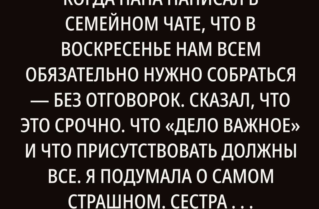 Всё началось в среду вечером, когда папа написал в семейном чате, что в воскресенье нам всем обязательно нужно собраться без отговорок. Сказал, что это срочно. Что «дело важное» и что присутствовать должны все.