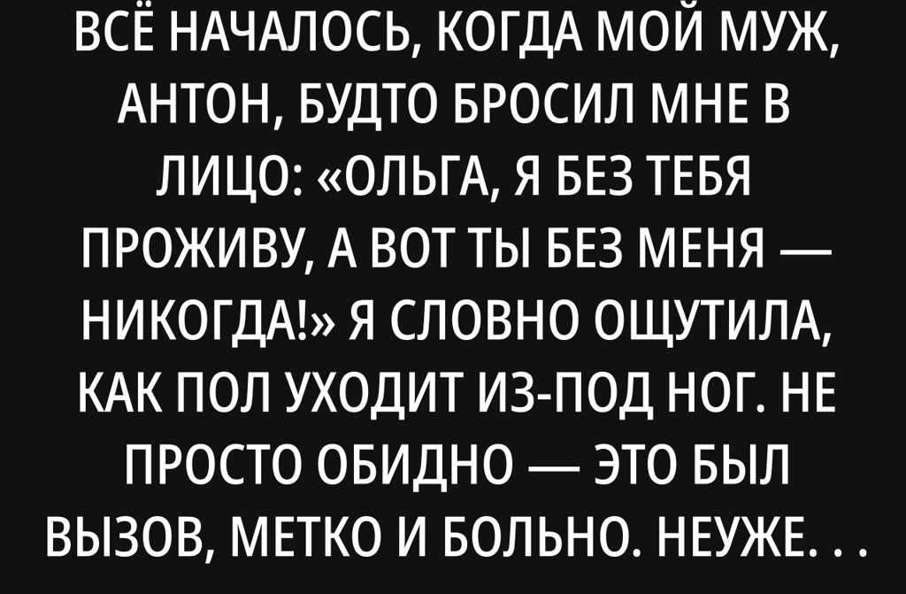 Всё началось, когда мой муж, Антон, будто бросил мне в лицо: «Ольга, я без тебя проживу, а вот ты без меня никогда!» Я словно ощутила, как пол уходит из-под ног. Не просто обидно это был вызов, метко и больно. Неужели он правда думает, что я слаба, что я только и могу жить у него за спиной, и без него у меня всё рухнет? Ну что ж, посмотрим! С этого дня я дала себе слово: больше не быть его тенью. Нашла себе подработку, чтобы строить собственную жизнь без его «заботы». Пусть знает: это я стану сильнее, чем он вообще способен представить.