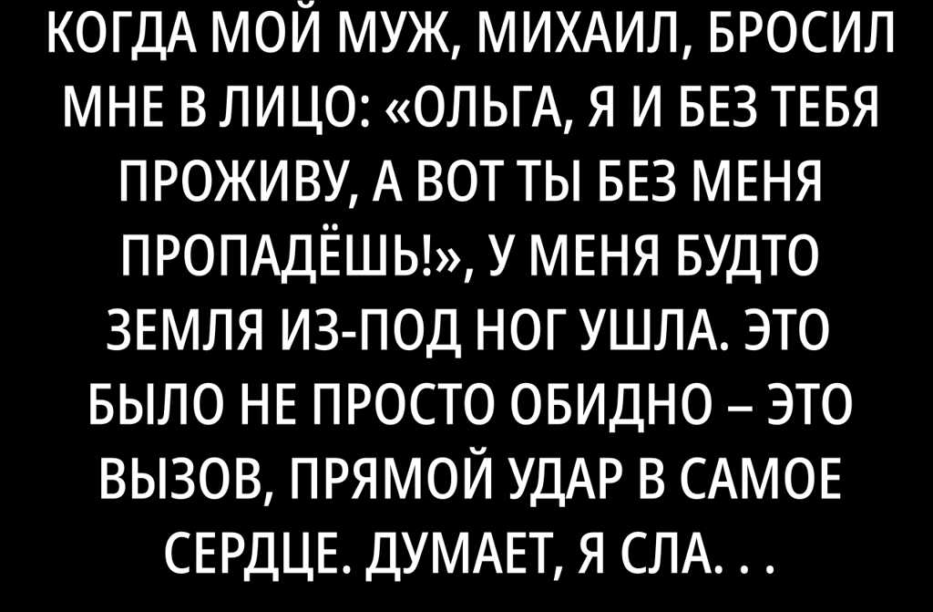 Когда мой муж, Михаил, бросил мне в лицо: «Ольга, я и без тебя проживу, а вот ты без меня пропадёшь!», у меня будто земля из-под ног ушла. Это было не просто обидно это вызов, прямой удар в самое сердце. Думает, я слабая, что полностью от него завишу, что моя жизнь без него рассыплется? Ну, посмотрим! В тот день я твёрдо решила: хватит быть его тенью. Я устроилась на подработку, чтобы строить свою собственную жизнь без его «заботы». Пусть знает: я не только справлюсь, я стану сильнее, чем он способен себе представить.