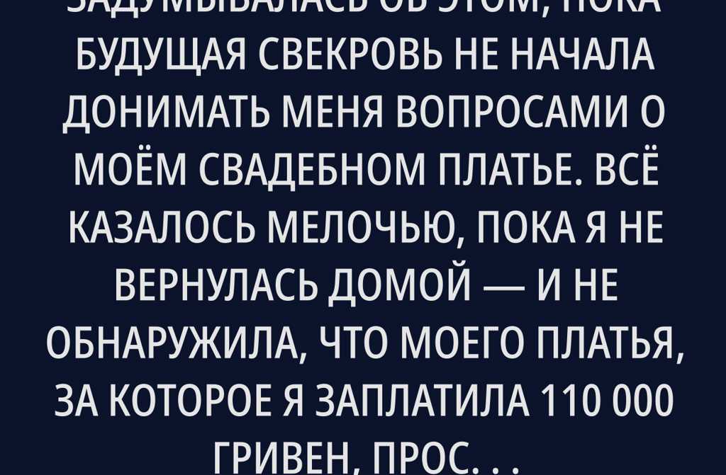 Я никогда особо не задумывалась об этом, пока будущая свекровь не начала донимать меня вопросами о моём свадебном платье. Всё казалось мелочью, пока я не вернулась домой и не обнаружила, что моего платья, за которое я заплатила 110000 гривен, просто нет! Она не только примерила его, но и умудрилась всё испортить, отказавшись даже возместить ущерб. Я была в ярости и полной отчаяния, но мне помог один неожиданный козырь.