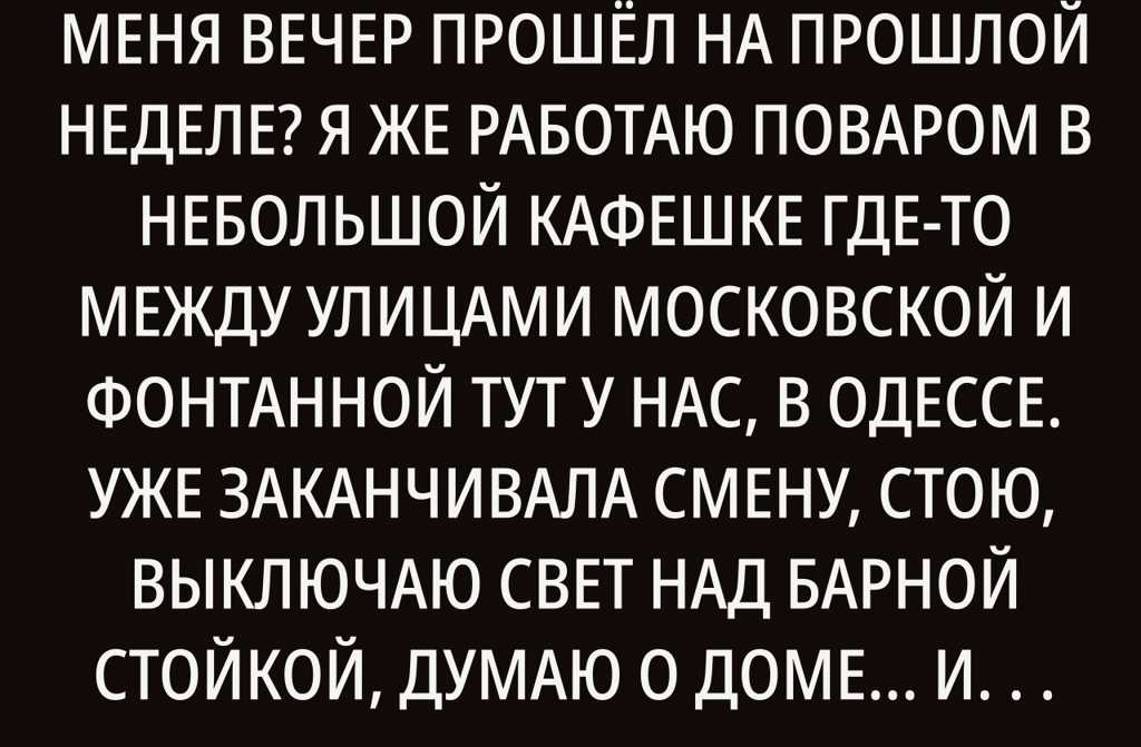 Слушай, представляешь, как у меня вечер прошёл на прошлой неделе? Я же работаю поваром в небольшой кафешке где-то между улицами Московской и Фонтанной тут у нас, в Одессе. Уже заканчивала смену, стою, выключаю свет над барной стойкой, думаю о доме И тут замечаю за витриной мужчину сидит прямо у дороги, кутался в тонкий потрёпанный плащ. Рядом у ног здоровенная собака, чёрно-рыжая, такого у нас только в Одессе увидишь!
