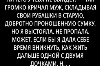 Мой любимый просто оставил свои ключи от квартиры, сказав что меня бросает. Детям было грустно без отца, часто спрашивали меня, когда он вернется. Финансовые проблемы также дали о себе знать, нужно было просить деньги на продукты. С двумя детьми на декретные деньги жить было тяжело, моя мать чем могла тем и помогала. Я бы мужу все простила, только бы он вернулся.