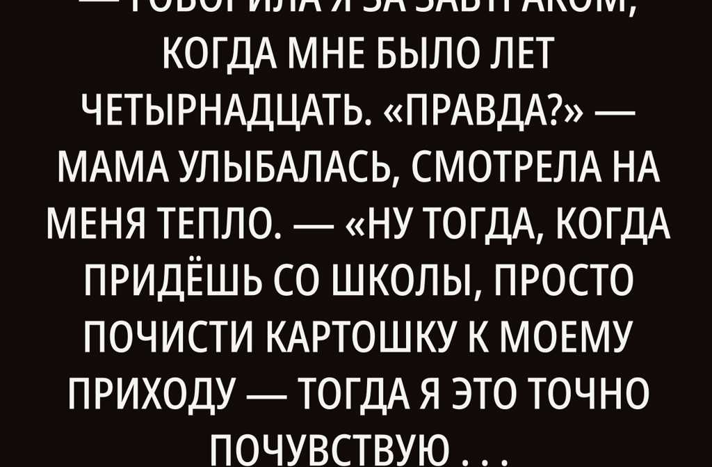 «Правда?» мама улыбалась, смотрела на меня тепло. «Ну тогда, когда придёшь со школы, просто почисти картошку к моему приходу тогда я это точно почувствую и без слов».