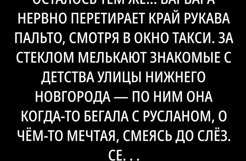 Варвара нервно перетирает край рукава пальто, смотря в окно такси. За стеклом мелькают знакомые с детства улицы Нижнего Новгорода по ним она когда-то бегала с Русланом, о чём-то мечтая, смеясь до слёз. Семь лет Целых семь лет она не появлялась в родном городе.